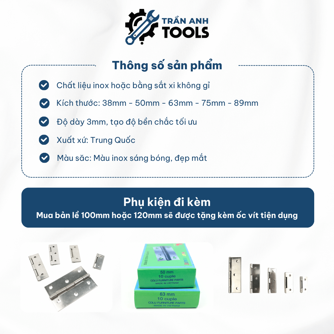 | Phụ kiện đi kèm | Mua bản lề 100mm hoặc 120mm sẽ được tặng kèm ốc vít tiện dụng |
