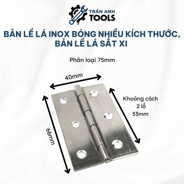 Bản lề lá Inox nhiều kích thước từ Trần Anh Tools là sản phẩm chất lượng cao, không thể thiếu trong các công trình nội thất. Với chất liệu inox 304 và sắt xi không gỉ, bản lề này mang đến độ bền chắc và thẩm mỹ vượt trội, là sự lựa chọn tối ưu cho mọi loại cửa.