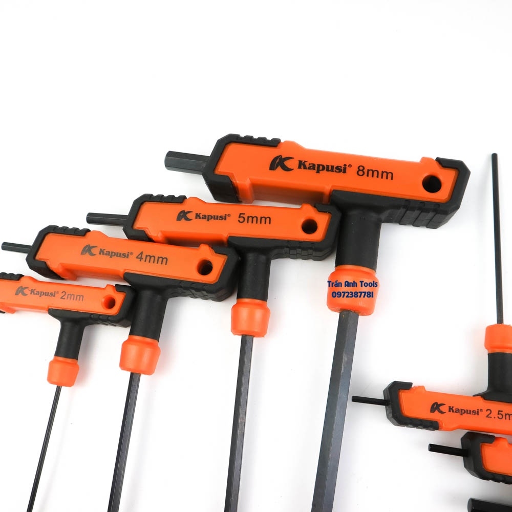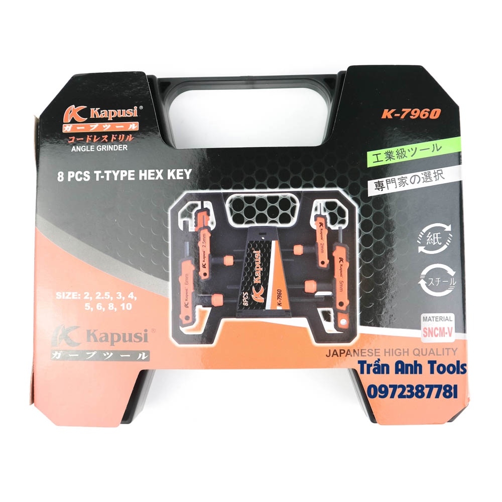 Bộ lục giác chữ T 8 chi tiết gồm các cỡ 2 2.5 3 4 5 6 8 10 Kapusi Japan, bộ lục giác tê cao cấp chất lượng Nhật Bản có độ cứng gấp nhiều lần so với các sản phẩm thông thường, bạn sẽ không còn phải lo trường hợp nó có thể bị cong vênh hay biến dạng khi xảy ra va đập mạnh. Khi bạn sử dụng lực để vặn 1 con ốc có độ cứng cao thì cũng không lo bị tòe đầu. Bộ lục giác T giá rẻ này có kiểu kích thước hệ mét thông dụng hiện nay, sẽ phù hợp với nhu cầu sử dụng trong công việc từ đơn giản đến chuyên nghiệp.
