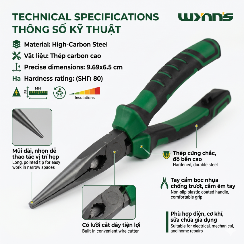Tên Sản Phẩm: Kìm Mũi Nhọn 200mm Thép Hợp Kim Tay Cầm Chống Trượt Wynns Super Pliers Kìm Điện Dài Kẹp Chi Tiết Sửa Chữa Đa Năng